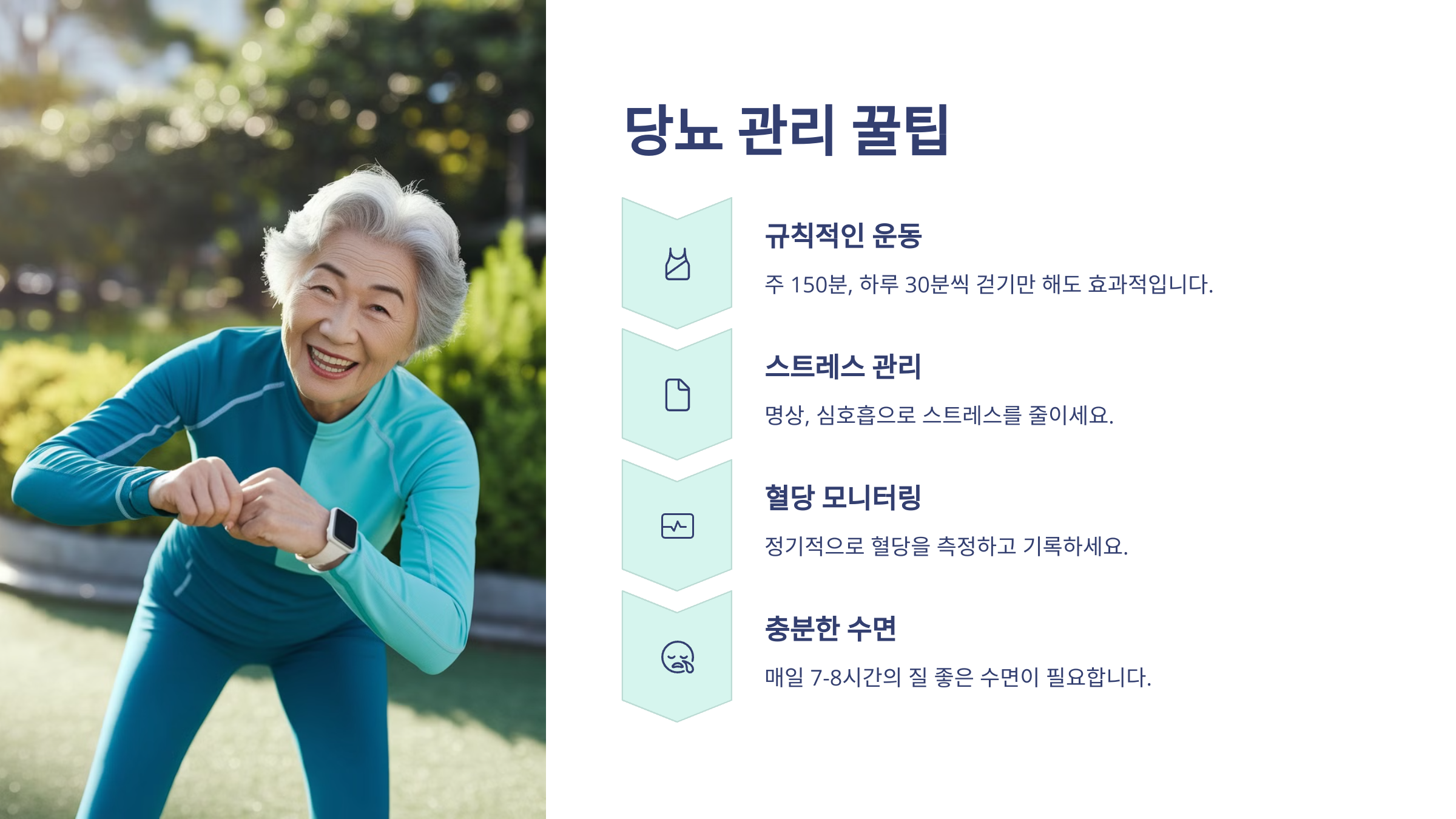 3. 스트레스 줄이기 : 스트레스는 인슐린 저항성을 높이고 혈당 조절을 어렵게 해요. 하루 10분 명상이나 심호흡을 습관으로 만들어보세요.