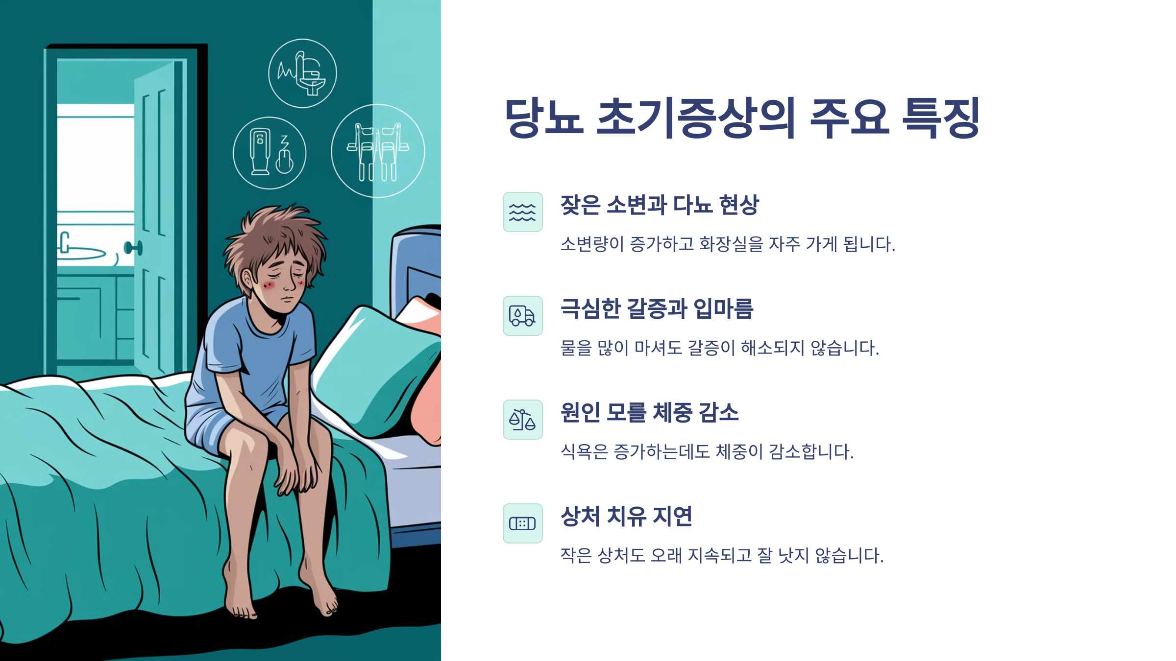 1. 잦은 소변 – 당이 소변으로 빠져나가면서 배뇨 횟수가 늘어나요. 특히 밤에 화장실을 자주 가게 되면 의심해볼 필요가 있어요.
