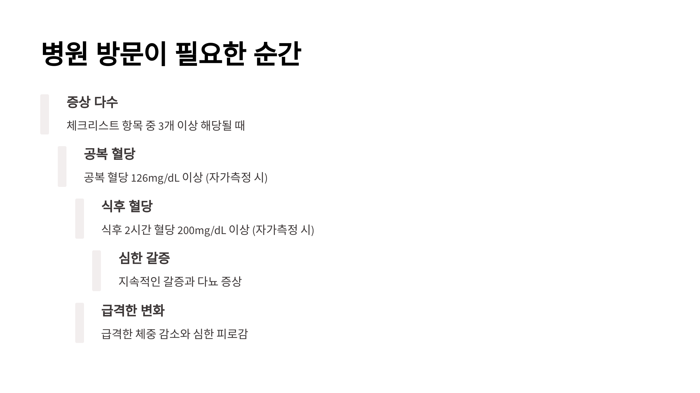 어느 정도 증상을 느끼더라도 병원에 가야 할 타이밍을 놓치는 경우가 많아요. “그냥 피곤해서 그렇겠지”, “나이 들면 원래 이렇지”라고 넘기다 보면 당뇨가 악화될 수 있어요. 아래 상황 중 하나라도 해당된다면 망설이지 말고 진료를 받아보는 게 좋아요.