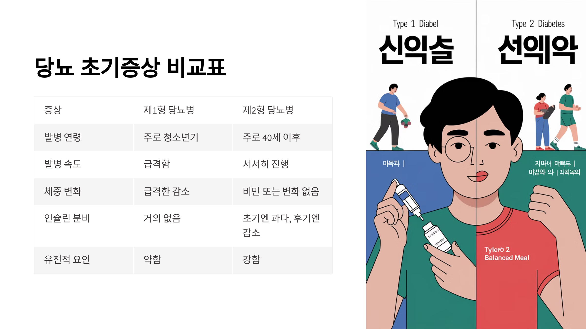 | 원인 | 자가면역, 인슐린 생산 안됨 | 생활습관, 인슐린 저항성 |