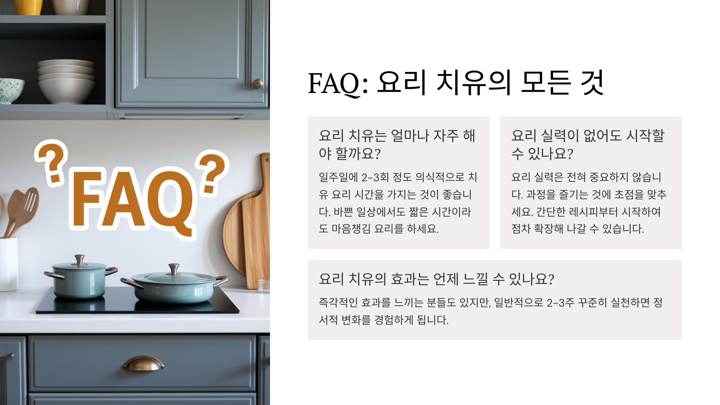 A4. 오히려 혼자 먹는 요리는 자기 돌봄의 핵심이에요. 나를 위해 만든 요리는 자존감을 키워줘요.