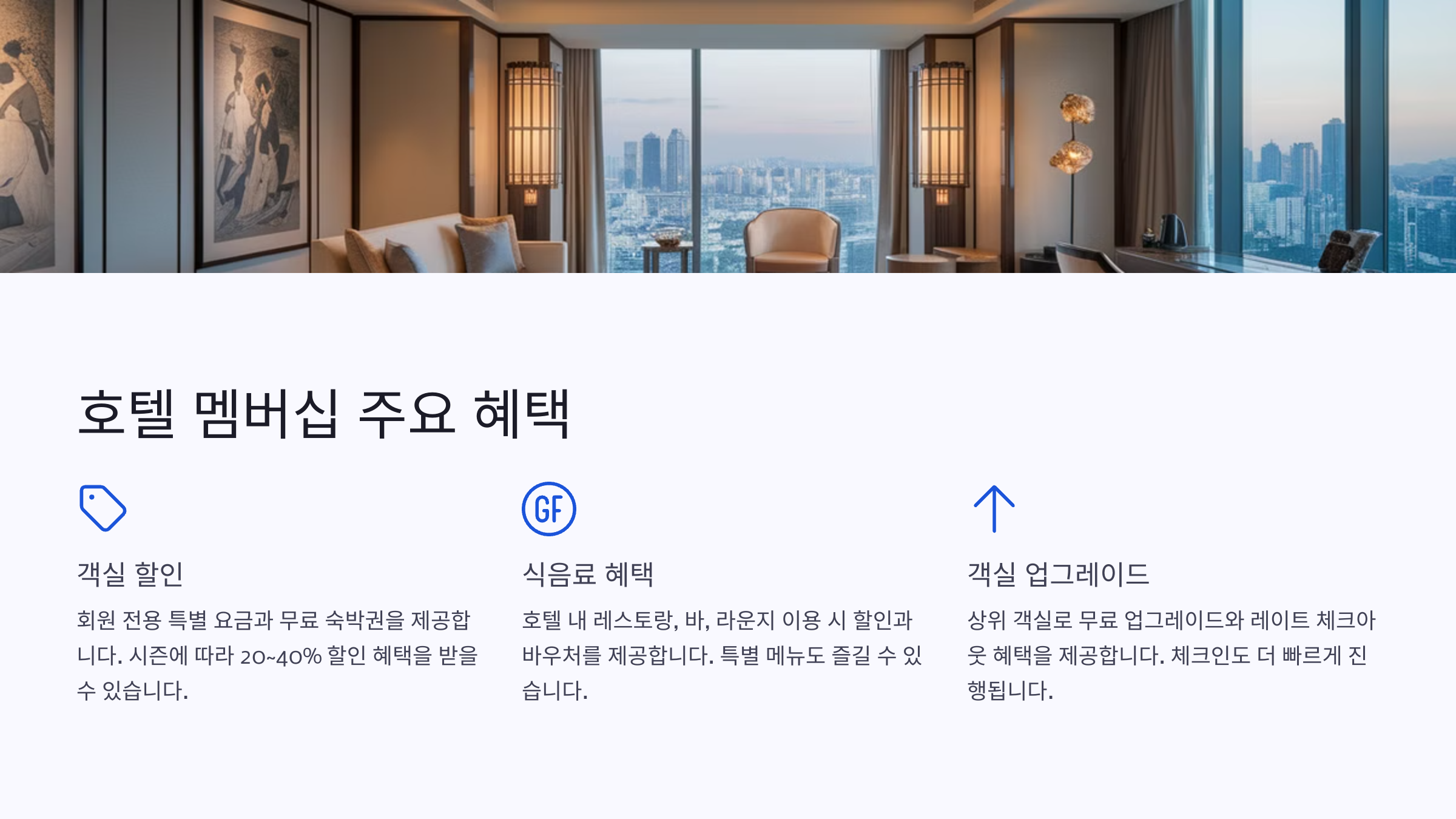 🏨 국내 호텔 멤버십은 숙박뿐만 아니라 레스토랑, 스파, 피트니스 등의 다양한 혜택을 제공해요. 호텔을 자주 이용하는 사람들에게는 매우 유용한 선택지가 될 수 있죠.