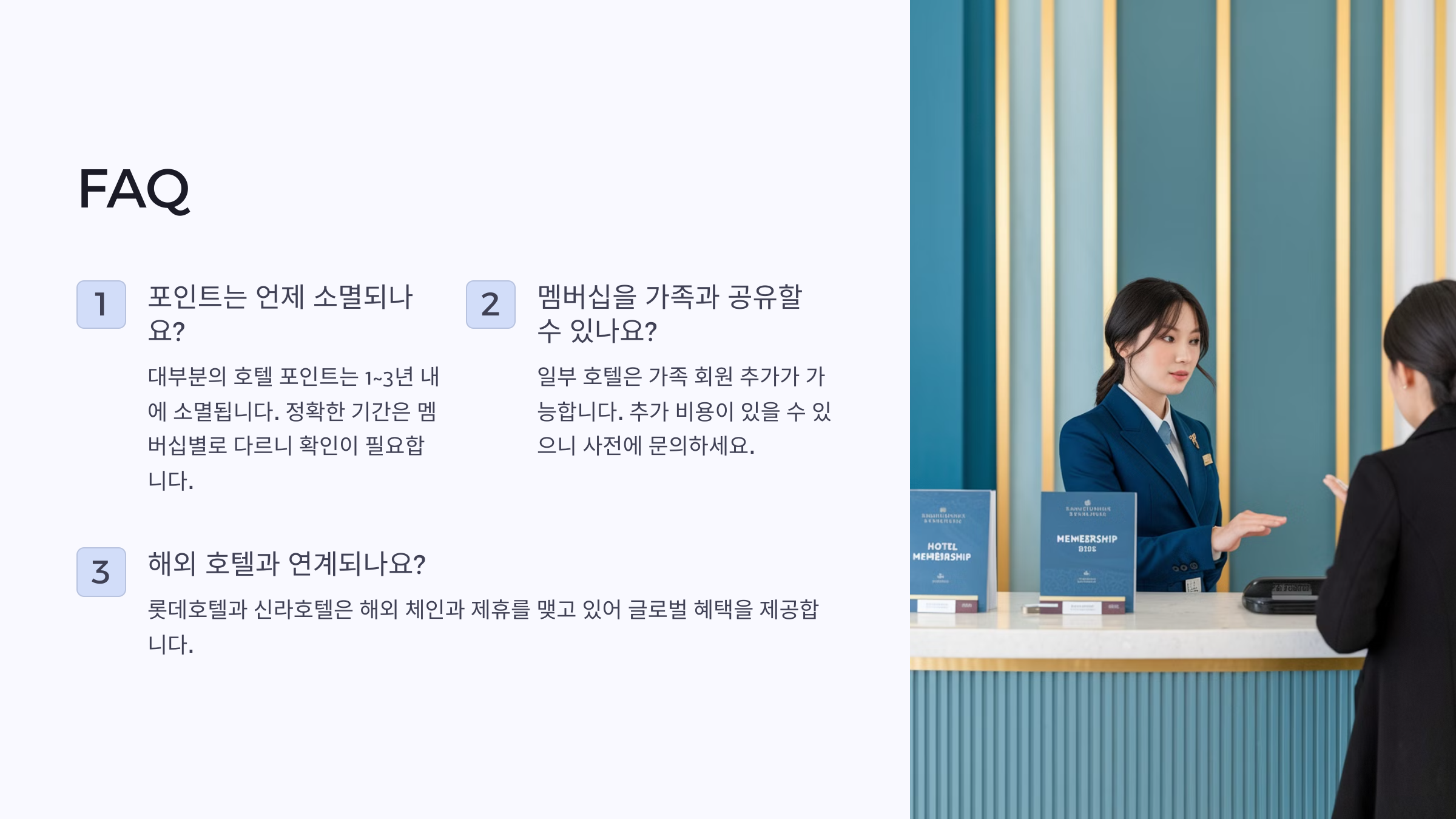 A3. 적립한 포인트는 객실 요금 할인, 부대시설 이용(레스토랑, 스파 등), 상품권 교환 등에 사용할 수 있어요. 호텔마다 사용처가 다르니 확인하는 것이 좋아요.