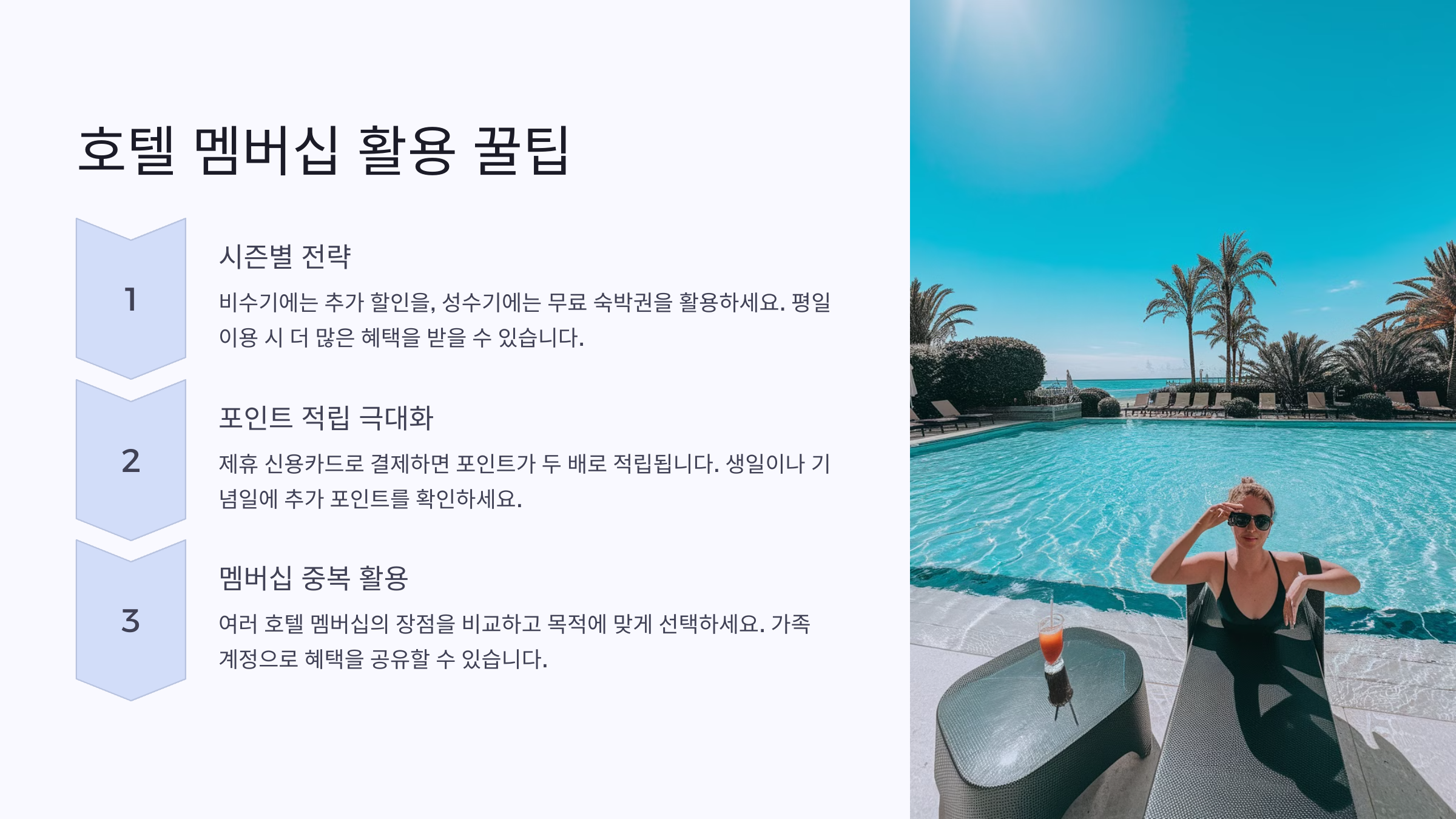 이런 팁들을 잘 활용하면, 호텔 멤버십의 혜택을 극대화할 수 있어요! 여행을 더욱 스마트하고 합리적으로 즐겨보세요. 😊