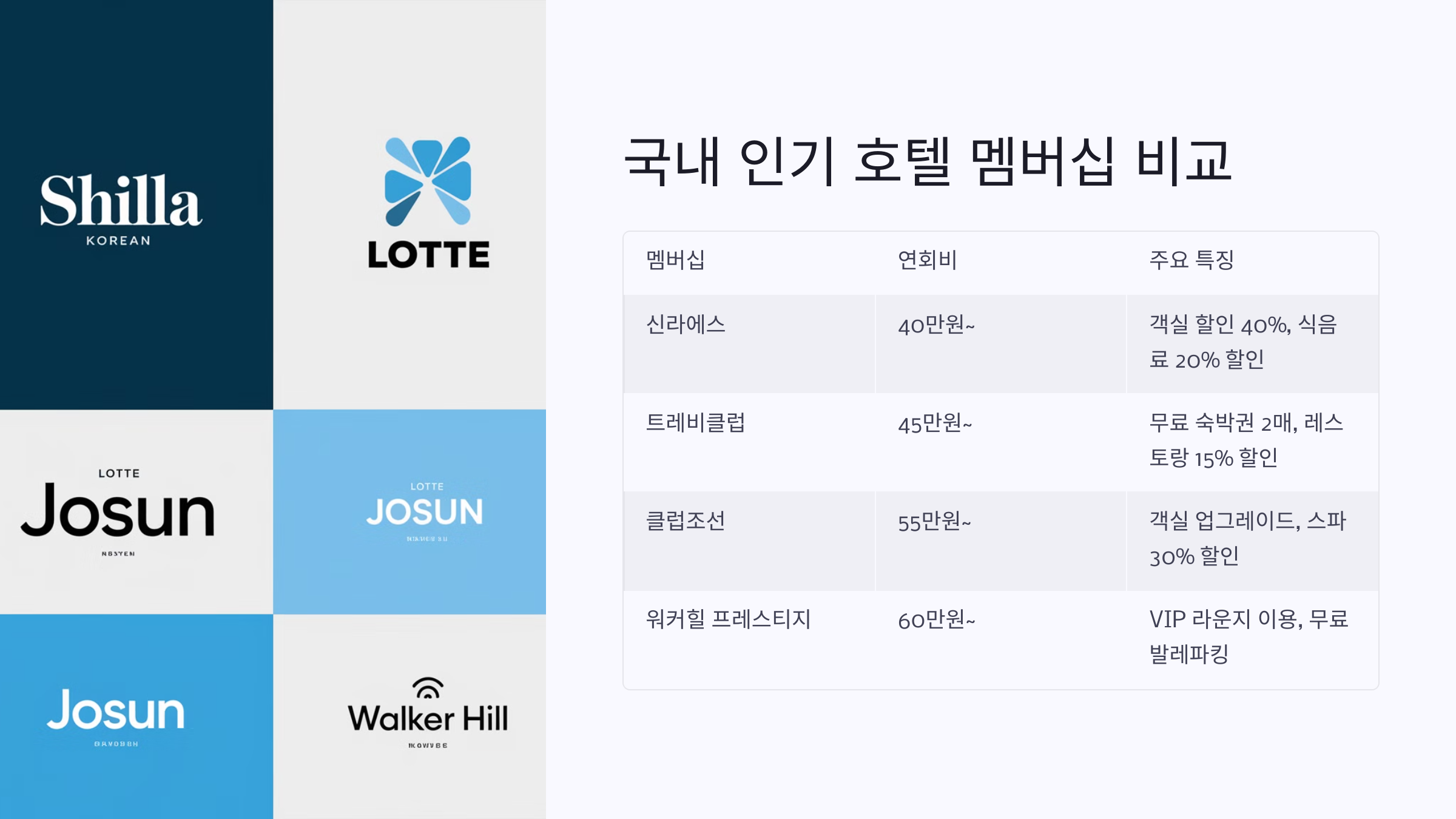 | 조선호텔 | 조선호텔앤리조트 멤버십 | 유료 (약 50만 원) | 무료 숙박권, 조식 제공 |