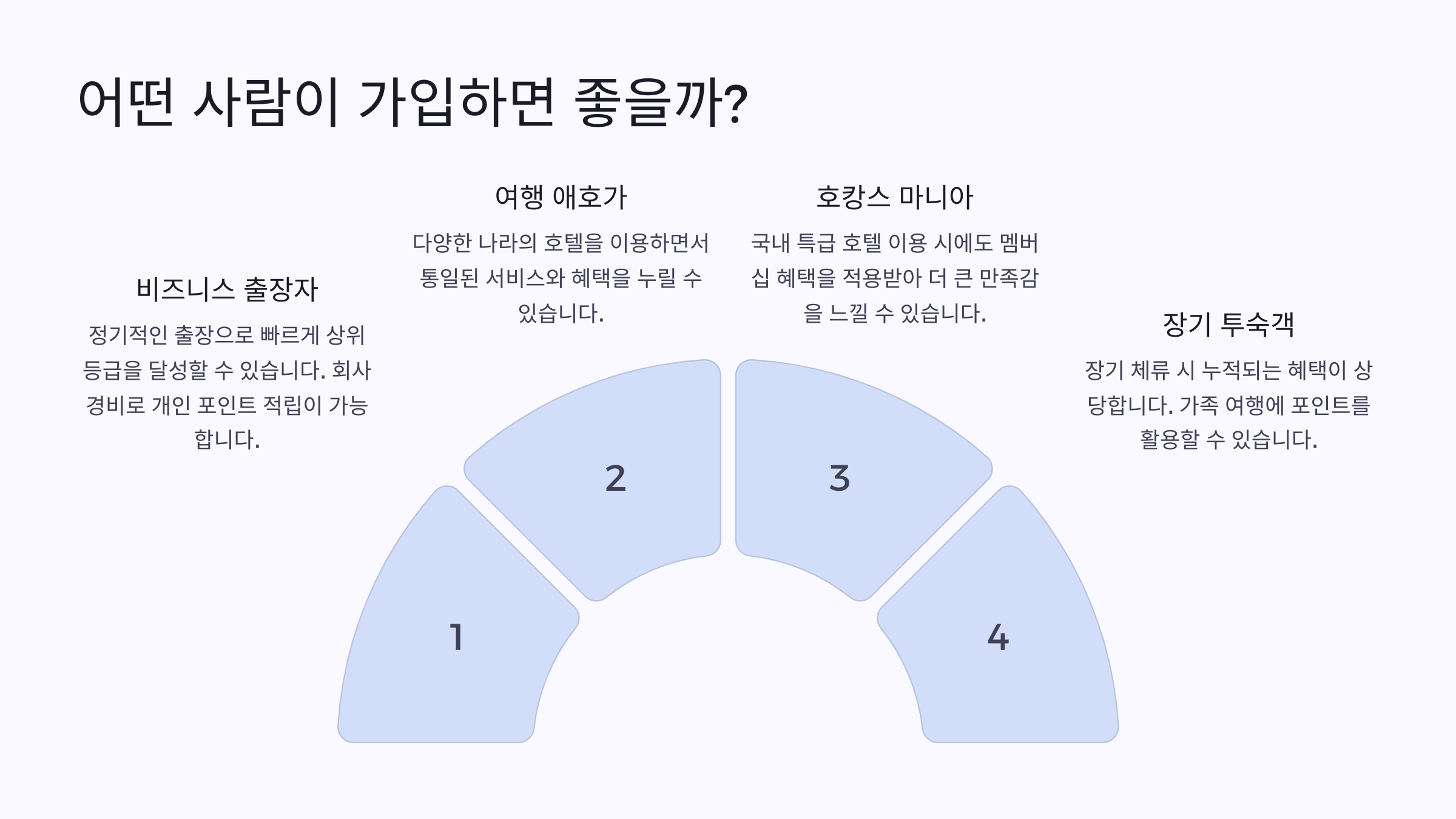 | 신용카드 혜택을 활용하고 싶은 사람 | 호텔 제휴 신용카드를 사용하면 포인트를 더욱 빠르게 적립할 수 있어요. |
