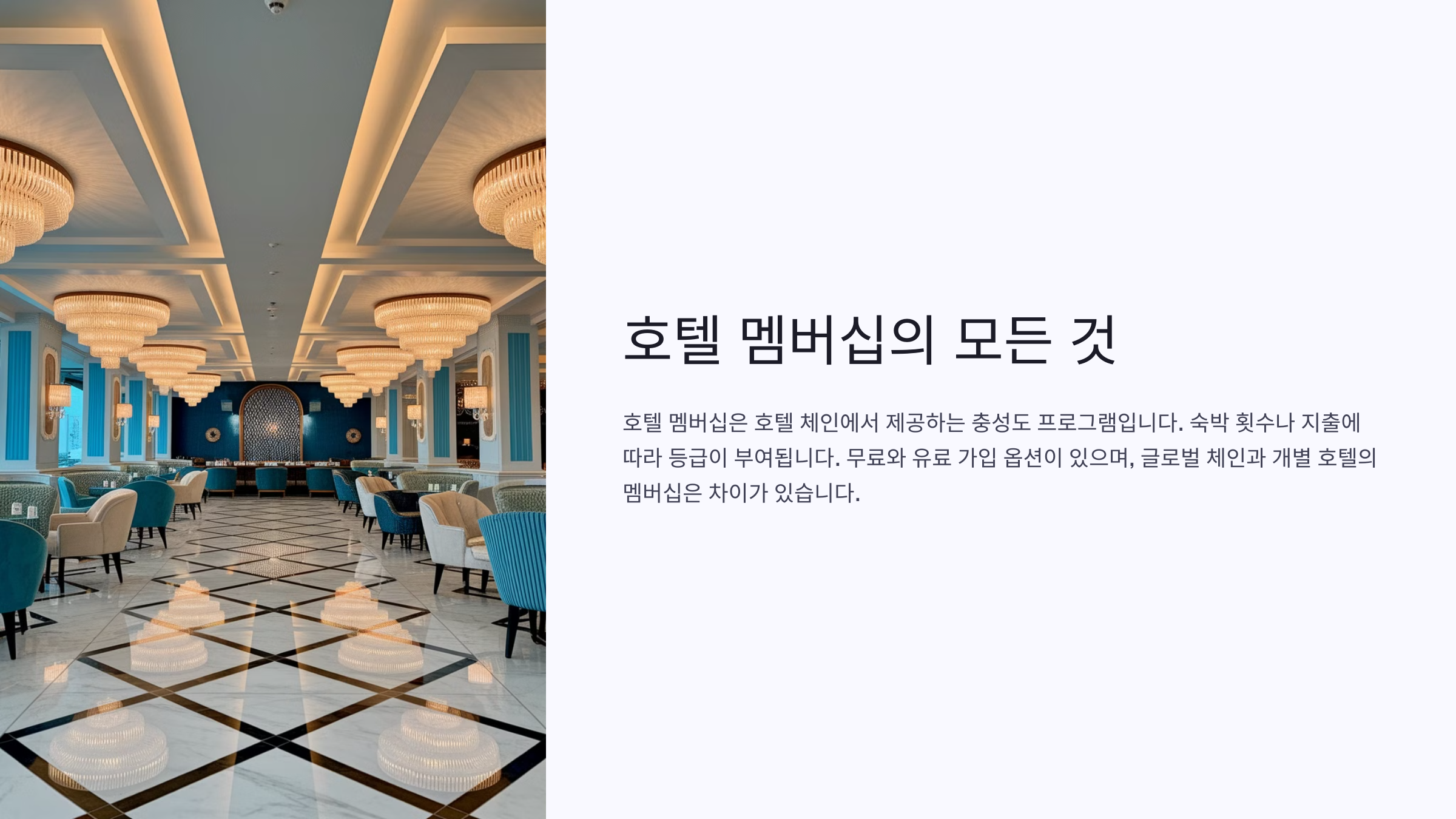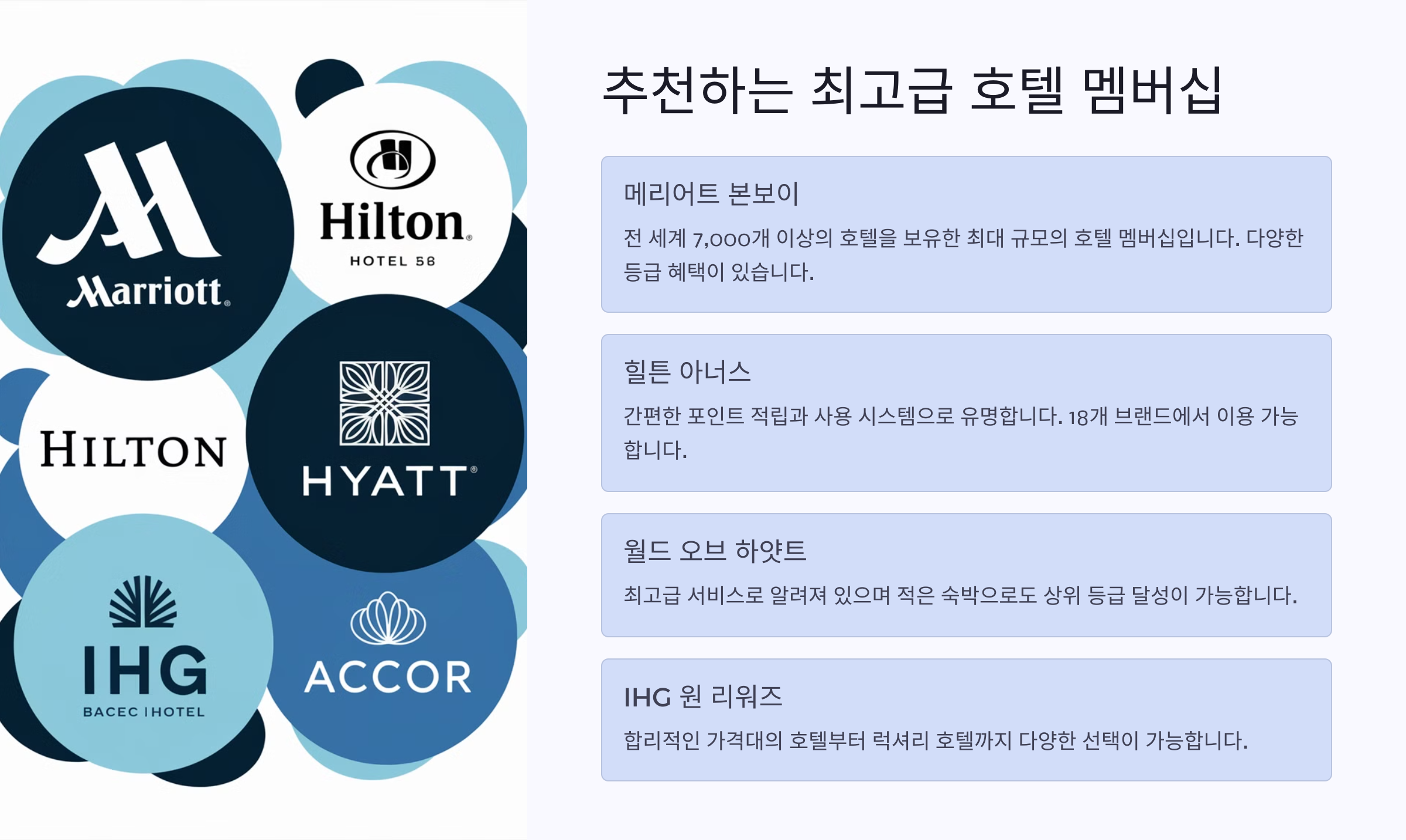 🏨 호텔 멤버십을 활용하면 더욱 편안하고 럭셔리한 여행을 즐길 수 있어요. 본인의 여행 스타일에 맞는 멤버십을 선택해 최고의 혜택을 누려보세요! ✨