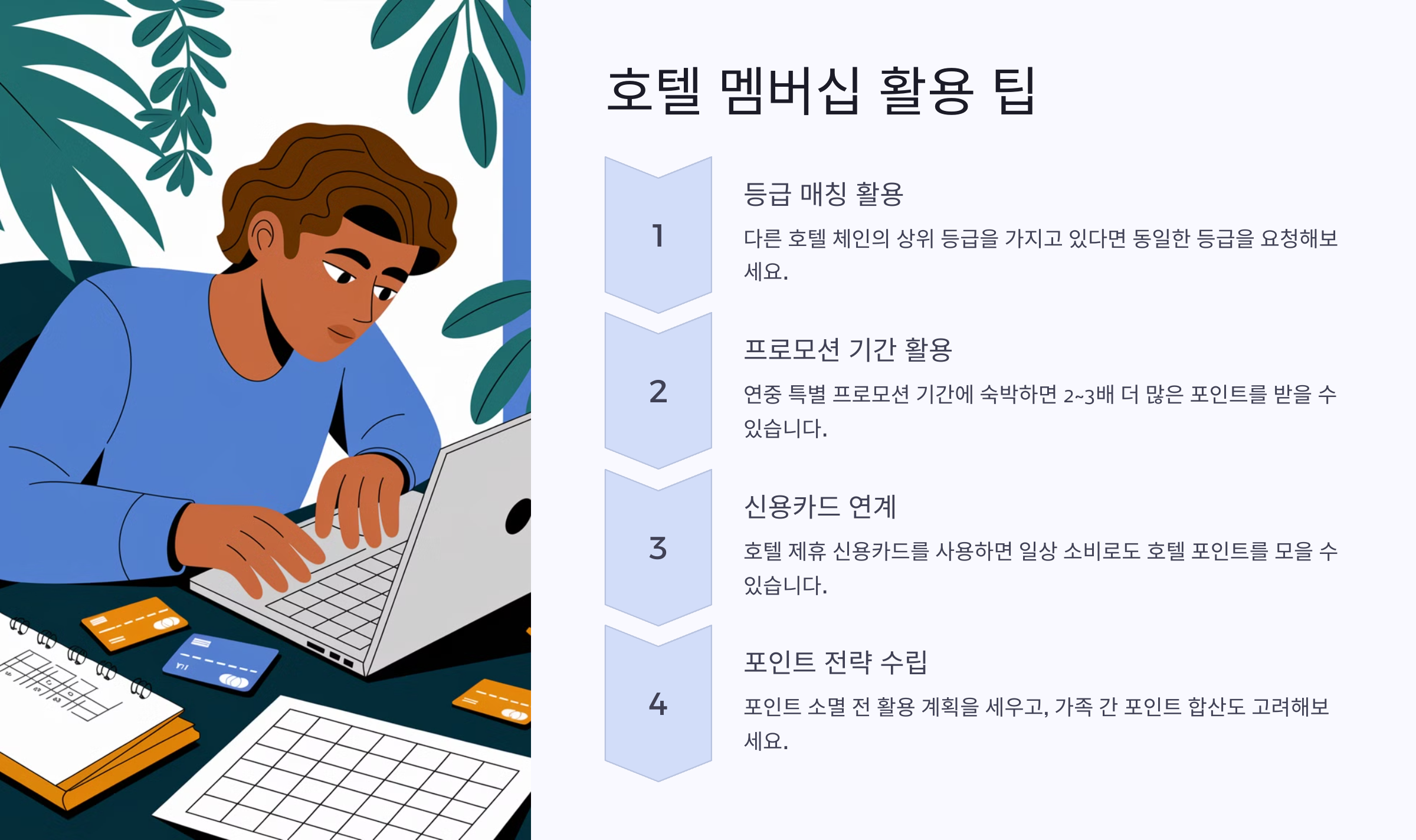 | 프로모션 활용 | 호텔에서 제공하는 멤버십 프로모션을 적극 활용하면 포인트 적립이 쉬워요. |