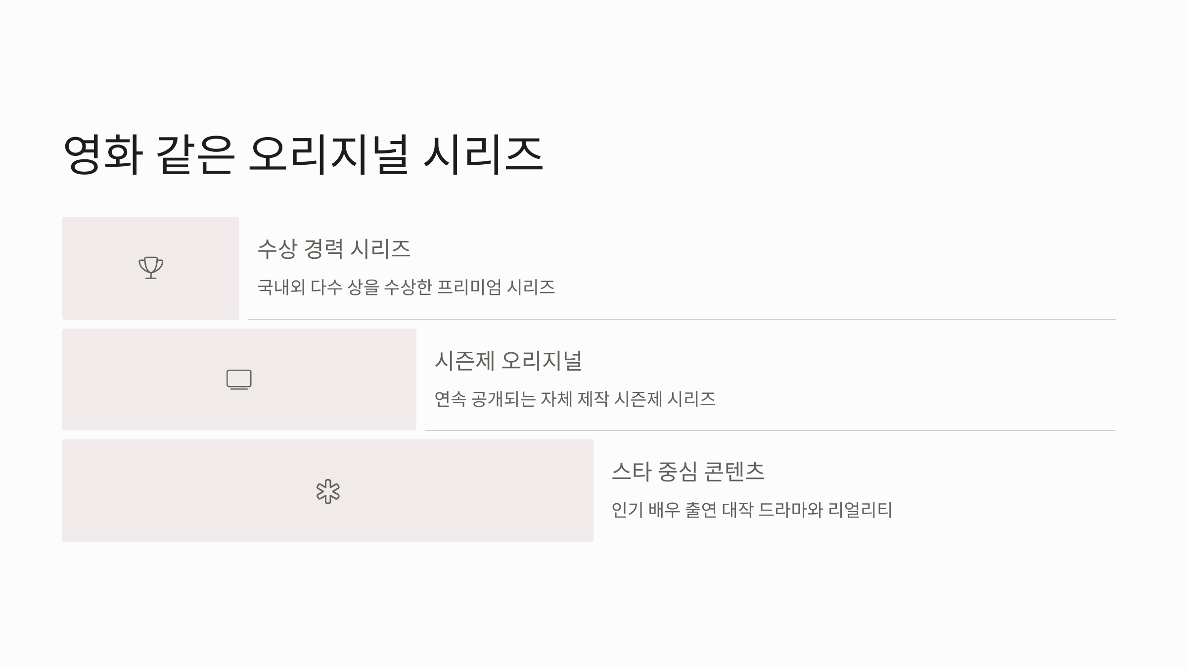 A8. 주 단위로 업데이트되며, 매달 신작 큐레이션도 따로 제공돼요. 새로 나온 오리지널은 홈 화면에서 확인 가능해요.